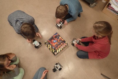 Vi skulle programere roboten til å kjøre rundt en boks, vi var på skolen i 4 timer.